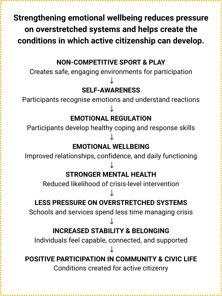 To increase access to evidence-based mental and emotional wellbeing interventions through sport, with the intention of bringing about meaningful social change.